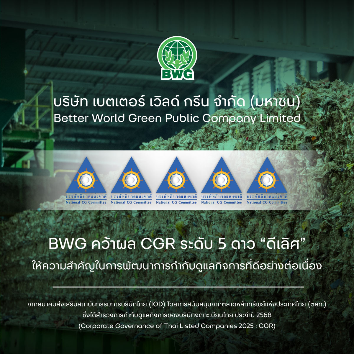บริษัท เบตเตอร์ เวิลด์ กรีน จำกัด (มหาชน) หรือ BWG ได้รับการปรับเพิ่มอันดับความน่าเชื่อถือขององค์กรขึ้นถึง 2 ระดับในครั้งเดียว จากระดับ ‘BB+’ เป็น ‘BBB’ พร้อมให้แนวโน้มอันดับเครดิต “คงที่” (Stable) จากบริษัท ทริสเรทติ้ง จำกัด การปรับอันดับเครดิตครั้งนี้ เกิดจากสภาพการเงินที่มีความแข็งแรง สภาพคล่องสูง หนี้สินลดต่ำลงอย่างมีนัยสำคัญ เสริมสร้างสถานะผู้นำในธุรกิจการบริหารจัดการกากอุตสาหกรรมเพื่อความยั่งยืน ซึ่งสะท้อนถึงความสำเร็จอย่างเป็นรูปธรรมจากกลยุทธ์การบริหารงานที่เฉียบคม