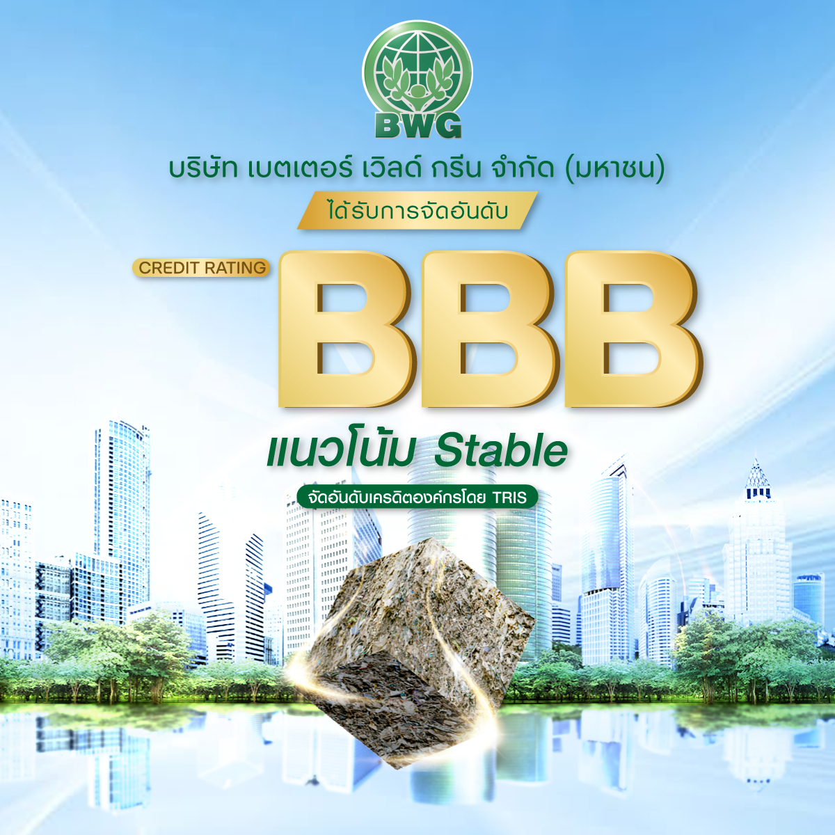 บริษัท เบตเตอร์ เวิลด์ กรีน จำกัด (มหาชน) หรือ BWG ได้รับการปรับเพิ่มอันดับความน่าเชื่อถือขององค์กรขึ้นถึง 2 ระดับในครั้งเดียว จากระดับ ‘BB+’ เป็น ‘BBB’ พร้อมให้แนวโน้มอันดับเครดิต “คงที่” (Stable) จากบริษัท ทริสเรทติ้ง จำกัด การปรับอันดับเครดิตครั้งนี้ เกิดจากสภาพการเงินที่มีความแข็งแรง สภาพคล่องสูง หนี้สินลดต่ำลงอย่างมีนัยสำคัญ เสริมสร้างสถานะผู้นำในธุรกิจการบริหารจัดการกากอุตสาหกรรมเพื่อความยั่งยืน ซึ่งสะท้อนถึงความสำเร็จอย่างเป็นรูปธรรมจากกลยุทธ์การบริหารงานที่เฉียบคม